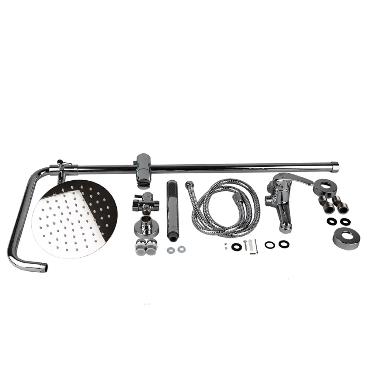 Душова система з верхнім душем та душовим набором TARK GH Душова система з верхнім душем і душовим набором без виливу TARK GH – складається з ручної лійки з тримачем, шлангового під’єднання з перемикачем, душового шланга в металевому обплетенні, а також верхнього круглого душу з кронштейном, душової штанги і настінного одноважеля. Сучасний і унікальний дизайн і висока якість матеріалів, що використовуються, гарантують довговічність і надійність на довгі роки.